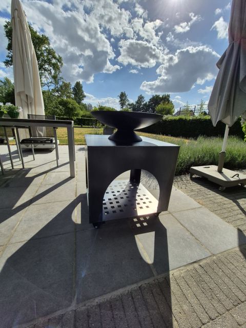 Voor een buitenhaard op het terras maakten we het volledige technische tekenwerk. De metalen constructie werd nauwkeurig ontworpen zodat ze stabiel, veilig en duurzaam is. Dankzij het doordachte ontwerp ontstaat een stijlvolle vuurhaard die zomeravonden gezelliger en warmer maakt.